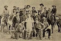 There are so many dare-devils in pictures, that it seems a difficult matter to award the palm of courage to any particular company of screen players. But certainly Jack Ford's would give the others a run for their money. This is the way they looked when they began work on Jack's picture, The Trail of Hate, but no one could induce them to pose after the picture was completed. When Jack has finished a picture his players are not fit for publication....[8]