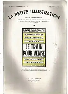 The Train for Venice (French: Le train pour Venise) is a 1937 comedy play by Georges Berr and Louis Verneuil. A farce, it premiered at the Théâtre Saint-Georges in Paris with a cast that included Verneuil, Huguette Duflos, André Alerme and Roland Armontel.