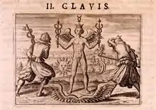The Twelve Keys of Basil Valentine is a widely reproduced alchemical book attributed to Basil Valentine. It was first published in 1599 by Johann Thölde who is likely the book's true author.[1] It is presented as a sequence of alchemical operations encoded allegorically in words, to which images have been added. The first Basil Valentine book to discuss the keys is Ein kurtz summarischer Tractat, von dem grossen Stein der Uralten ("A Short Summary Tract: Of the great stone of the ancients"), 1599.