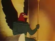 Dr. Henderson & Lois have been captured by a race of "Hawk Men", living in the caverns. The explosion blasted open a hole in their cave, giving them a passage to the surface. Dr. Henderson & Lois are brought before their king. They see a statue of Dr. Henderson's father above the king's throne. Neither of them understands why the Hawk Men have a statue like that or where they got it. The king signals to the others and Lois & Dr. Henderson are tied to a stone slab.