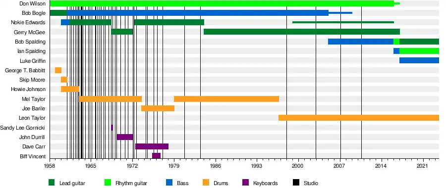 • Nokie Edwards – lead guitar, bass guitar (1960–1968, 1972–1985; as guest 1999–2016; died 2018)[39]