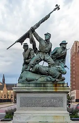 Conway's sculpture is the most important nineteenth century Civil War monument in Wisconsin.[1] Four Union soldiers cast in bronze are caught in action, moving forward to victory. One of the soldiers has fallen and supports himself on his left arm, while grasping a piece of the flag staff in his right hand. A young private holds the flag high while stepping over the dying soldier. An officer with a pistol in one hand and a drawn sword in the other continues forward, while another private leans forward holding a bayonet.
