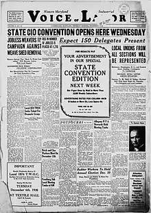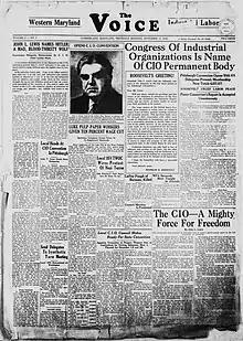 The Voice of Labor was a biweekly newspaper covering issues related to the labor movement and was published from December 1, 1938, to July 30, 1942, in Cumberland, Allegany County, Maryland, after which point it became the Western Maryland edition of The CIO News.[1] It was originally founded in 1937 by labor activists James Blackwell and Clyde D. Lucas as The Voice during a time of great upheaval in the American labor movement. The paper was published by the Western Maryland Industrial Union Council of the Congress of Industrial Organizations (CIO). Blackwell was a veteran labor organizer and left-wing agitator who had previously led the People's Unemployment League in Baltimore and the city's United Auto Workers. He acted as the paper's inaugural managing editor until June 1941.[2] Lucas was a native of western Maryland and leader of the textile workers at the massive Celanese plant in Cumberland.