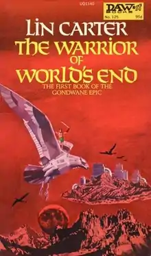 The Warrior of World's End is a 1974 fantasy novel by American writer Lin Carter, set on a decadent far-future Earth in which all the world's land masses have supposedly drifted back together to form a last supercontinent called Gondwane. The book is chronologically the first in Carter's Gondwane Epic (the culminating novel Giant of World's End having been issued earlier). It was first published in paperback by DAW Books, then reprinted twice through November 1978. A trade paperback edition was published by Wildside Press in January 2001.[1] The book includes a map by the author of the portion of Gondwane in which its story is set.