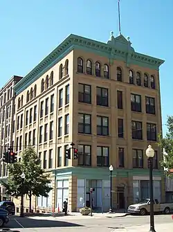 The Wellman Building, also known as the Wellman Block, is a historic commercial building located at Jamestown in Chautauqua County, New York. It consists of an 1897 masonry bearing wall structure and a steel frame structure built in 1910. The 1897 building is a five-story, Renaissance Revival brick building. The 1910 addition retains the Renaissance Revival style. The building originally housed a druggist and stationery store on the first floor, with offices on the upper floors.[2]