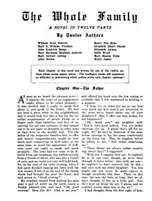 The Whole Family: a Novel by Twelve Authors (1908) is a collaborative novel told in twelve chapters, each by a different author. This unusual project was conceived by novelist William Dean Howells and carried out under the direction of Harper's Bazaar editor Elizabeth Jordan, who (like Howells) would write one of the chapters herself. Howells's idea for the novel was to show how an engagement or marriage would affect and be affected by an entire family. The project became somewhat curious for the way the authors' contentious interrelationships mirrored the sometimes dysfunctional family they described in their chapters. Howells had hoped Mark Twain would be one of the authors, but Twain did not participate. Other than Howells himself, Henry James was probably the best-known author to contribute. The novel was serialized in Harper's Bazaar in 1907–08 and published as a book by Harper's in late 1908.