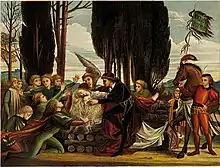 The brothers discover Elisa's plight and try to speak to the king but fail, thwarted by the rising sun. Even as the tumbril bears Elisa away to execution, she continues knitting, determined to continue up to the last moment of her life. This enrages the people, who are on the brink of snatching and ripping the shirts into pieces when the swans descend and rescue Elisa. The people interpret this as a sign from Heaven that Elisa is innocent while she finishes the last shirt, but the executioner still prepares for the burning. When Elisa throws the shirts over the swans, her brothers return to their human forms. The youngest brother has a swan's wing instead of an arm, as Elisa did not have time to finish one sleeve of his shirt. Elisa is now free to speak and tell the truth but faints from exhaustion, so her brothers explain. As they do so, the firewood around Elisa's stake miraculously takes root and bursts into flowers. The king plucks the topmost flower and places it on Elisa's chest. She is revived by the white flower, and the king and Elisa are married.