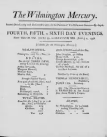 The Mercury was founded by W. C. Smyth in September 1798 as a response to the outbreak of yellow fever going through Wilmington, Philadelphia, and New York City.[2] It was published daily and given without charge. All issues included the names of those who had died in the last 24 hours, as well as encouraged donations to the Board of Health.[3] Though it first had just listed deaths in Wilmington, by October 4 it listed Philadelphia and New York City too. It also listed the names of people who contributed to the Board of Health as well as gave important advice about dealing with the outbreak. When the epidemic subsided in November, The Mercury closed.[2] Its last issue was published on October 30.[4]
