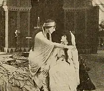 The Moving Picture World in its coverage of the film's release also informs its readers that Zora "is put to death" at the end of the story.[19] In Louisville, Kentucky, the reviewer for The Courier-Journal apparently saw the same tragic, fiery ending as well, for the newspaper's film critic reports that after Riques and the witch are captured "Zora calmly pays the penalty."[20] Yet, the "photoplay" critic George Graves for the Chicago trade journal Motography and Joshua Lowe of the widely read New York-based entertainment paper Variety describe an entirely different finale to the film, one that is more commonly cited in the media in 1916. Graves simply says that after Zora awakens Dorores "the witch is set free."[4] Lowe in his March 3 review expresses his frustration with that same "vague" ending and even speculates that Powell had created another version of the closing scenes: