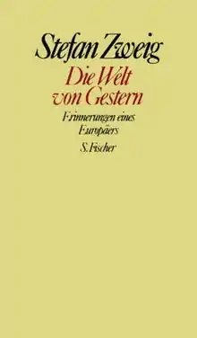 The World of Yesterday: Memoires of a European (German title Die Welt von Gestern: Erinnerungen eines Europäers) is the memoir[1][2][3] of Austrian writer Stefan Zweig.[4] It has been called the most famous book on the Habsburg Empire.[5] He started writing it in 1934 when, anticipating Anschluss and Nazi persecution, he uprooted himself from Austria to England and later to Brazil. He posted the manuscript, typed by his second wife Lotte Altmann, to the publisher the day before they both committed suicide in February 1942. The book was first published in Stockholm (1942), as Die Welt von Gestern.[6] It was first published in English in April 1943 by Viking Press.[4] In 2011, Plunkett Lake Press reissued it in eBook form.[7] In 2013, the University of Nebraska Press published a translation by the noted British translator Anthea Bell.[8]