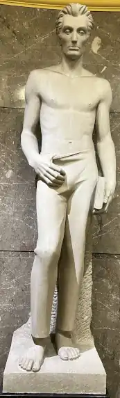 The statue exemplifies public art of the New Deal,[4] including its depiction of Lincoln in his youth, a popular topic of the era.[5] It was built as a result of Hansen winning a 1939 Federal Works Agency art contest, and it was the first large sculpture he had ever completed.[6] In creating the statue, Hansen "developed his own interpretation of Lincoln, portraying him as a young man standing barefoot and shirtless - a man of deep sentiment and understanding."[7]