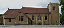 St Tarcisius Church, Camberley, was built between 1923 and 1926 primarily as a memorial to Catholic British Army officers who lost their lives in World War I. It was designed by the architect F A Walters, and is a Grade II Listed Building. It was built of Bargate coursed stone rubble with Bath stone dressings and has a tiled roof. St Tarcisius was a martyr of the early Christian church who lived in the 3rd century. He died at the hands of a mob rather than deliver to them the Blessed Sacrament, which he was carrying. Woodroffe completed three windows for this church. The first was installed in 1923 and depicts the Visitation, the second of 1935 is a five-light traceried window depicting the Crucifixion, and the final 1945 window of two-lights has the theme "Noli me tangere".[25] St Tarcisus also has stained glass by Edward Woore and Harry Stammers.