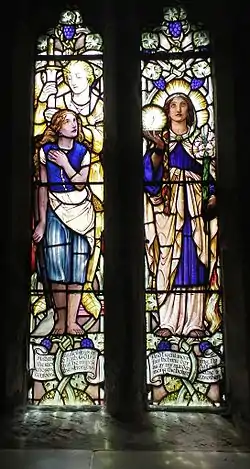 Woodroffe executed a two-light window for this church in Great Urswick, Cumbria. The window is situated in the West wall of the church and is known as the Maids' Window. It was presented to the church in 1913 by The Girls' Friendly Society, which was an extensive international organisation for Christian girls and young women which still exists in some places. On the stone sill under the window is the following inscription: "Guinevere Kennedy, Marguerite her sister and with other Maidens have given The Maids' Window. Commenced Sept 11 1912, completed Jan. 24 1913."