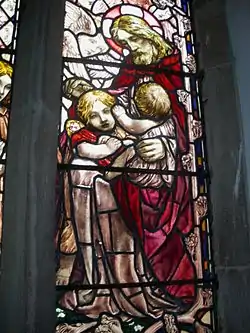 St Ethelbert in Herringswell, Suffolk has a marvellous collection of stained glass including three Whall windows and one by Jeremy Brett. Woodroffe's "Suffer little children" is therefore in good Arts and Crafts company. Woodroofe's window is situated in the Chancel North wall. In Woodroffe's composition he includes a doll carried by the little girl, as she approaches Christ.[14]