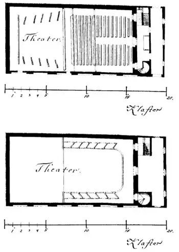 The theater was a three-story structure having a divided parterre (ground level) and two galleries (balconies). The external walls and roof were of brick and the interior was of wood. According to Krzeszowiak the theater had "very good acoustics".[7] No description of the theater's capacity survives. The dimensions of the theater were 30 by 15 meters;[8] Buch judges that the theater must have held over 500 spectators;[9] Kurt Honolka estimates 800, then 1000 following an expansion carried out by Emanuel Schikaneder.[10]