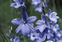 Thelymitra venosa, commonly known as the large veined sun orchid,[2] is a species of orchid that is endemic to New South Wales. It has a single fleshy, channelled leaf and up to six relatively large, bright-blue flowers with darker veins. The arms on the side of the column are twisted and yellow, but not toothed at the tip. Unlike most other thelymitras, the flowers do not usually close on cloudy days.