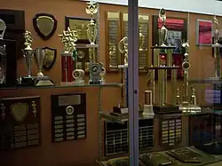 Trophy case featuring the 1992 National High School Chess Championship trophy along with other awards