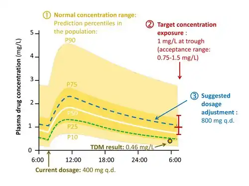 - Determine whether the patient's concentration profile is close to the “exposure target” associated with the best trade-off between probability of therapeutic success and risk of toxicity. This refers to clinical pharmacodynamic knowledge describing dose-concentration-response relationships among treated patients.