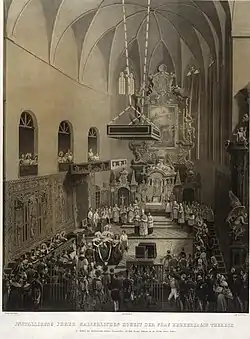The Theresian Stift was founded in 1755 by Empress Maria Theresa in order to serve as a religious order for impoverished noblewomen.[1] The Institute officially opened in 1755 and was housed in Prague Castle, enrolling thirty unmarried young women from Austrian and Hungarian aristocratic families who were financially strained.[2] The noblewomen lived as secular canonesses and were not required to take vows of celibacy and were allowed to leave the chapter in order to marry.[3]