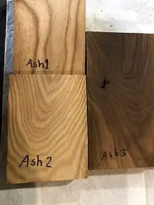 Beechwood processed at different temperatures. From left to right: 200 °C, 190 °C, untreated