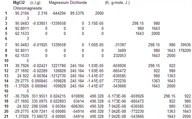 Thermodynamic datafile for MgCl2(c,l,g) from FREED. Some values have truncated significant figures for display purposes. The explanation for the values is shown below.