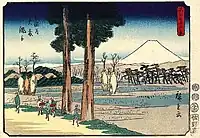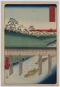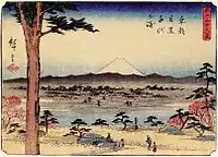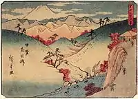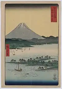 Thirty-six Views of Mount Fuji (Japanese: 富士三十六景, Hepburn: Fuji Sanjū-Rokkei) is the title of two series of woodblock prints by Japanese ukiyo-e artist Hiroshige, depicting Mount Fuji in differing seasons and weather conditions from a variety of different places and distances. The 1852 series, published by Sanoya Kihei, are in landscape orientation using the chūban format, while the 1858 series are in the portrait ōban format and were published by Tsutaya Kichizō.[1][2] The same subject had previously been dealt with by Hokusai in two of his own series, Thirty-six Views of Mount Fuji, produced from c. 1830 to 1832,[3] and One Hundred Views of Mount Fuji, published in three volumes from 1834 to 1849.[4]