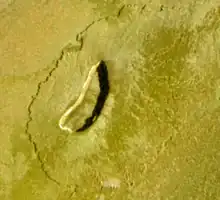 Thomagata Patera is a volcano on Jupiter's moon Io. It is located on Io's anti-Jupiter hemisphere at 25°40′N 165°56′W / 25.67°N 165.94°W / 25.67; -165.94[1], to the east of the nearby active volcanoes Volund and Zamama. Thomagata is a kidney-shaped Ionian patera, a type of volcanic crater similar to a caldera, 56 kilometers (35 mi) long, 26 km (16 mi) wide, and 1.2–1.6 km (0.7–1.0 mi) deep.[2] The volcano is currently inactive as a thermal hotspot has never been observed at Thomagata and the bright floor of the patera suggests that it is cold enough for sulfur dioxide and sulfur to condense.[3] Thomagata is located near the center of a low, 100 km (62 mi) wide mesa. The edge of the mesa rises 200 meters (660 ft) above the surrounding plains, however the slope up to the edge of Thomagata Patera is unknown. If the floor of the patera is at the same level as the surrounding plains, the western slope of the mesa would have a grade of 2°.[2] The morphology of this mesa and the pattern of faded lava flows along its slopes radiating away from Thomagata (at least on its eastern side) suggest that Thomagata Patera and the mesa that surrounds it may be a shield volcano, also called a tholus on Io.[3] The irregular margin of the mesa and the lack of debris at the base of its basal scarp suggest that it was modified by sulfur dioxide sapping.[3]