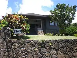 The Thomas Alexander Burningham House at 2849 Pali Highway in Honolulu, Hawaiʻi, built in 1910, is a good example of the earliest American Craftsman bungalow homes in the city. Its flaired hip roof and stone-and-stucco siding differentiate it from the many gabled, and often half-timbered, bungalows built during the 1920s. The architect was Thomas Gill (the father of Thomas P. Gill), who designed the Oahu Country Club building and many residences in Honolulu between 1899 and 1941.[2] The house was listed in the National Register of Historic Places in 1993.[1]