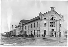 This was "one of the first major station structures to be constructed by the CPR", designed in brick on Main Street, Winnipeg, by Sorby, in 1882. It was on the track to Kicking Horse Valley, British Columbia. It was burned down in 1886, but was rebuilt on the remaining walls. That restoration was later demolished, to be replaced with the Royal Alexandra Hotel in 1906.[117]
