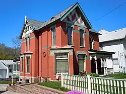 Built in 1887, it is an unusual and well-preserved brick example of an eclectic combination of Colonial Revival, Gothic Revival, and Queen Anne architectural elements.[2] Cavin owned a dry goods store nearby. He lived here until he died in 1911, and the house remained in the family until 1919. At some point it had been converted into apartments. The house was damaged in a fire in 1934, and had to be partially rebuilt, especially the roof. The front porch is not original.