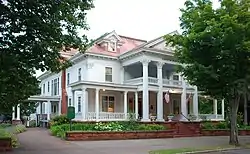 The Hoatson House is a 2+1⁄2-story wood-frame structure of Neoclassical design. The house is rectangular with a red sandstone foundation and clapboard exterior.[3] The front facade is symmetric, with a central portico with Corinthian columns sheltering the main entrance and a one-story porch to each side.[3] A hipped roof with gabled dormers sits atop the house.[11]