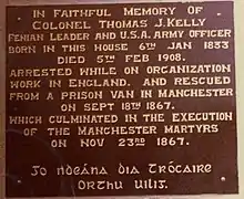 Kelly died at his residence, 31 East 130th Street in New York, on 5 February 1908.[15] He and his second wife, Anna Frances (née Dunne) (May 1860 – September 1913) are buried in Woodlawn Cemetery in the Bronx, New York City.[6] In 1967, on the centenary of the Fenian Rising, a commemorative plaque was placed at Kelly's ancestral home in Mountbellew.[3]