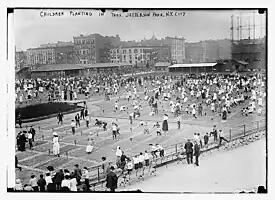 The recreation facilities in Thomas Jefferson Park opened on October 7, 1905, with a ceremony attended by several thousand people.[38][39] The park had cost $3 million to build, or about $4.46 per square foot ($48.0/m2). The high cost mostly came from the $2.7 million cost of land acquisition and was attributed to the existing density of East Harlem. There were initially separate facilities for boys and girls; each had a gymnasium, running track, playground, and shower area.[40][41] The New York Sun called Thomas Jefferson Park "the first playground in the world that has a running track for girls".[40] There was also a classical-style pavilion.[5][26][42] A "farm garden", with over a thousand plots for children, was added in May 1911.[43][44] The farm gardens, taking up 2 acres (0.81 ha),[45] were used to teach children horticultural skills.[5][46] A grove of trees, dedicated to veterans killed in World War I, was placed at First Avenue and 113th Street in 1923.[47] By the 1930s, neighborhood children preferred to play in the street rather than at the park.[42]