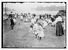 The New York City Board of Aldermen first devised plans in 1894 for Thomas Jefferson Park, to be built in Italian Harlem. The city acquired the land for the park starting in 1897.[5][26] Samuel Parsons was involved with the initial design.[26] An early plan for the park called for an artificial lake and marble cottage to be built in the park.[27] The recreational facilities also included a 200-by-60-foot (61 by 18 m) pier on the nearby Harlem River, which opened in 1899.[28] The development of the park was intended to help Italian Harlem, which the Brooklyn Daily Eagle described as "for many years the black spot of Harlem"; the existing buildings on the park's site were demolished in mid-1899.[29] By the end of that year, the last buildings on the site were being demolished.[30] The last lots, acquired from the Consolidated Gas Company, had been delayed due to disputes over compensation.[31]