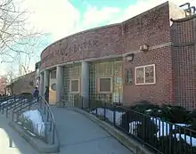 The main entrance is flanked by two L-shaped wings, which extend east around the pool area.[16][18] The northern wing was designed with locker and restroom facilities for women, while the southern wing was designed with facilities for men.[18][21] The recreation center also contains a fitness room, afterschool room, media lab, and multipurpose room.[23] The outer facades of both wings are grouped into vertical bays. Each bay contains square hopper windows, which only illuminate the top portions of the facade, as well as raised brick swags above the windows. Each bay is separated by stone pilasters topped by stone medallions. The corners of each wing are hexagonal. The pool area has a similar design to the outer facades.[15]