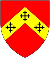 Arms of Hadley: Gules, on a chevron or three cross-crosslets sable