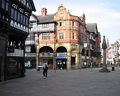 Thomas Meakin Lockwood (1830 – 15 July 1900) was an English architect whose main works are in and around Chester, Cheshire. He was born in London, and brought up in East Anglia.[1] From 1851 he was articled to Philip Causton Lockwood, the Borough Surveyor of Brighton. He then worked in offices including that of George Woodhouse, and of T. M. Penson in Chester. In 1862 he established an independent practice in Chester.[2] His works are located mainly in Cheshire, Shropshire, and North Wales, his designs being influenced by John Douglas and Norman Shaw. These are frequently either timber-framed, or in brick and stone incorporating Tudor, Elizabethan and Renaissance features. In Cheshire and North Wales, his most important patron was the First Duke of Westminster.[1] Lockwood's most prominent buildings, which stand at Chester Cross, were commissioned by the Duke. They stand on opposite corners at the north end of Bridge Street, and are in contrasting styles. Number 1 Bridge Street, built in 1888, is timber-framed in Black-and-white Revival style. Number 2–8 Bridge Street, built in 1894, is in stone and diapered brick, and incorporates Tudor, Jacobean and Baroque features.[3] Lockwood also designed the Grosvenor Museum, also in Chester, and built in 1885–86. It is constructed in red brick, and is in Renaissance style with Dutch gables.[4]