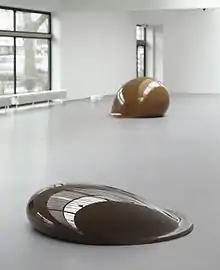 Rentmeister has become known to a larger audience with his high-gloss polyester sculptures which look like oversized blobs or comic figures.[3] Beginning in 1999, he has worked repeatedly with Nutella Spread and Penaten Baby Cream. He adopts “a set of industrially mass-produced domestic materials as units or building blocks, from sugar cubes and cotton tips to Tempo tissues, electrical sockets and whole refrigerators.”[4] He then makes sculptures using these materials.
