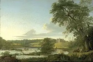 Roberts work was primarily of landscapes, usually featuring a country house. Among his surviving works are 4 views of Dawson Grove owned by Viscount Cremorne, a view of Lord Charlemont's Casino, Beau Park, County Meath, and 4 views of Carton House, County Kildare. In the style of Italian classical landscapes, Roberts also painted imaginary landscapes. He was commissioned by Sir Watkin Williams Wynn in 1775 to paint a pair of pictures for this home on St James's Square, London, which are still in place. Anthony Pasquin noted that he "gained more reputation as a landscape painter than any other Irishman", and fellow artist, John Warren thought that Roberts was the finest landscape painter in Britain or Ireland.[3] Among Thomas Roberts' patrons were William FitzGerald, 2nd Duke of Leinster and Richard Wingfield, 3rd Viscount Powerscourt.[5]
