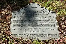 The relentless lecture circuit exhausted him, and he died in San Francisco on March 4, 1864, of diphtheria and pneumonia. His dying words were said to be "Beautiful boy", referring to his young son.[11] Over twenty thousand people attended his funeral and several of his friends including Charles Stoddard, Bret Harte and Ina Coolbrith published tributes.[12] King was first interred on the 100 block of Geary Street[13] and is now interred at First Unitarian Universalist Society of San Francisco at Starr King Way and Franklin Street between O'Farrell Street and Geary Street in San Francisco.[14] In the 1940s, most of San Francisco's dead were disinterred and moved to new resting places outside city limits; the grave of Starr King was one of the very few allowed to remain undisturbed.[15]