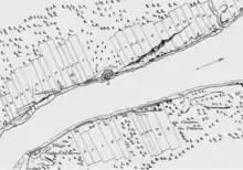 The 1796 map illustrates ribbon farms flanking Fort Detroit (center, above Detroit River) and across the river at what is now Windsor, Canada. The ribbon farm concept originated with Antoine de la Mothe Cadillac's founding of the fort, first called Fort Pontchartrain du Détroit, in July 1701. (See also the original map that covers a wider area, including Belle Isle Park)