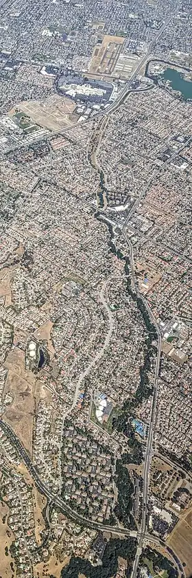 ![]() Paralleling Coyote Creek to the east is its tributary (via Lower Silver Creek) Thompson Creek, along San Felipe Road with Reid–Hillview Airport, Eastridge Mall, and Lake Cunningham at top, Yerba Buena Road at bottom. | |