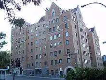 The Gleneagles is situated at 3940-3946 Côte-des-Neiges Road, with a height ranging from six to thirteen floors, and was built between 1929 and 1930. It is situated on land sold by the Sulpicians in 1929 to contractor Frederick Walter Dakin. The same year, the land was acquired by the company Investors Development Co. Limited, then transferred to Gleneagles Investment Co. Limited. This same company owned the Gleneagles from 1929 until 1987, when the building was sold to the Blason real estate company, and subsequently changed from apartments to condos. Its exterior walls are covered in dark brown brick, with its upper floors are crowned with crow-stepped gables, parapets and balustrades.[5][1][2]