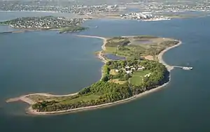 The island's highest point is a drumlin that reaches a height of 78 feet (24 m) above sea level. The rest of the island comprises low rolling hills and a salt marsh. The island has a mixed vegetation, including hardwood tree stands, remnant pear and apple orchards, ornamental trees and shrubs, and salt marsh grasses. The island has open meadows, forests, marine wetlands, sumac groves, and a variety of other geological features as well. Amenities include a formal school campus complete with classrooms, dormitories, dining hall, auditoriums, gymnasium, lab space, outdoor challenge courses, and climbing towers.[1] At low tide, a sandbar connects it to Squaw Rock on the Squantum peninsula, allowing land travel between the two.