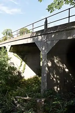 The railroad beneath the bridge has been abandoned for many years and is overgrown.[2]
