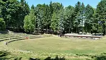 Originally named Sylvn Theatre, Thornden Park's amphitheater was built in 1933. The opening day ceremony was rained out but the subsequent opening was attended by 10,000 people. It is built to seat 6,000 people in its concentric rings and open lawn in the middle of the amphitheater. The Syracuse Opera puts on a free show the first Sunday in August each year. Since 2003, the Syracuse Shakespeare Festival has presented its free, Shakespeare-in-the-Park program, currently the first two weekends of June.