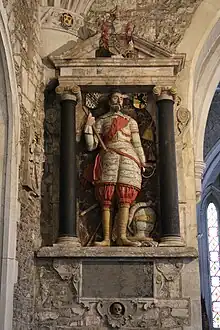 Mural monument in St Mary's Church, Ottery St Mary, to John Cooke (d. 1632) of Thorne. He stands dressed in armour, his helmet resting on the ground, and holds in his left hand the handle of his sheathed sword and in his right hand the baton of a military commander. On the wall of the aedicule behind on either side of his head are shown the arms of Cooke (left) and of Sherman (right). On top is a shield showing Cooke of 9 quarters, the first quarter being Thorne of Thorne
