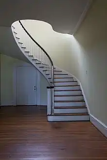 William Nichols is believed to be the architect of the main house at Thornhill, hired in 1832 by Thornton.[5] Nichols was made the state architect of Alabama in 1827. He is known for designing the original campus of the University of Alabama and now-destroyed Alabama State Capitol building at Tuscaloosa and the former Mississippi State Capitol building in Jackson, Mississippi. He is also believed to be the original architect of Rosemount, neighbor to Thornhill. Thornton served as Alabama's secretary of state from 1824 to 1834 and would have been very aware of Nichols and his work.[5] The main house at Thornhill was completed by 1833. The monumental two-story portico with six Ionic columns was added circa 1850. David Rinehart Anthony, of Eutaw, is believed to be the builder who made the portico addition and second story balcony (crisscrossed lattice railing). The house measures 55 feet (17 m) wide. Inside is a 14 ft (4.3 m) wide by 40 ft (12 m) long central hall with a fine spiral staircase at the back. There are two rooms to either side. The left front room was the parlor, with the dining room behind it. On the front right was the master bedroom with the plantation office behind it. Upstairs is a matching hall and four bedrooms. All eight rooms are 19.5 feet (5.9 m) square. The downstairs rooms have 12-foot (3.7 m) ceilings. The upstairs ceilings are 11 feet (3.4 m).
