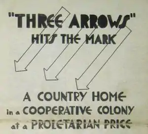Three Arrows Cooperative Society is a cooperative summer colony located in Putnam Valley, NY. It was founded in 1936 by members of the Young People's Socialist League, from whence its name and emblem derive.[1] The Society owns 125 acres of land which comprise 75 individual home sites as well as several communal buildings and access to Barger Pond. The colony, sometimes known as Camp Three Arrows, was imbued with socialist and communitarian values and offers a wide range of cultural, educational and leisure activities.[2]
