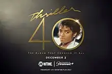 Thriller 40 is a 2023 documentary film about the 40th anniversary of Michael Jackson's 1982 album Thriller. The film, directed by Nelson George, was released in the United States on December 2, 2023. It aired on Showtime and was streamed on Paramount+ only for Showtime subscribers. Internationally, it debuted the same day in the U.K., Australia, Canada, Italy, France, Germany, Switzerland, Austria, Latin America, and South Korea.[1][2] On October 27, 2023, the trailer for the documentary was released.[1][3]